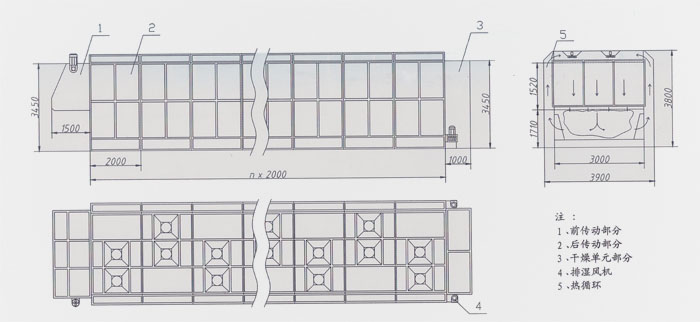本機由若干2米長的單元組成上下通道,皮張由通道下層輸入,通過上層通道干燥后卸下,每個單元都配有一組加熱裝置,機內共分2-3個溫度段,可根據工藝要求自由選擇控制溫度,其熱機效率高;濕氣排除由安裝在機器尾部的離心風機完成,主傳動配有無極調整裝置。